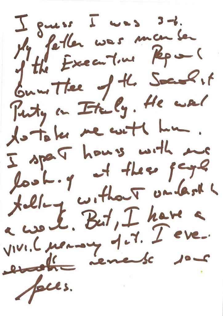 My father was a member of the Executive People’s Committee of the Socialist Party in Italy. He used to take me with him. I spent hours with him looking at these people. Talking without understanding a word. But, I have a vivid memory of it. I even members faces.