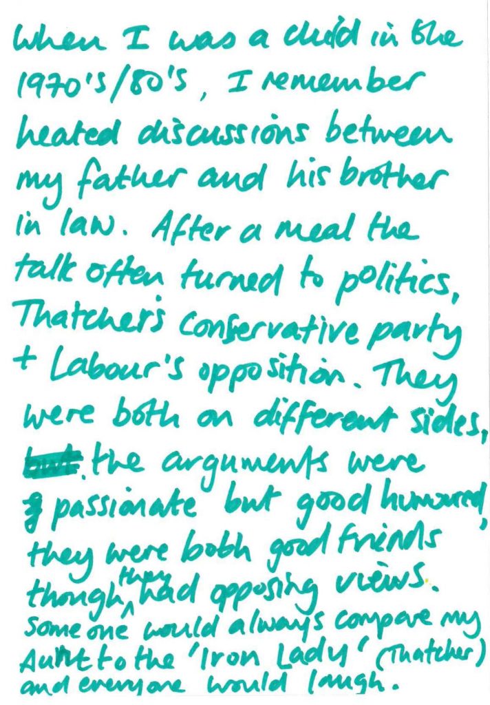 When I was a child in the 1970s/80s, I remember heated discussions between my father and his brother in law. After a meal the talk often turned to politics, Thatcher’s Conservative Party + Labour’s opposition. They were both on different sides, the arguments were passionate but good humoured, they were both good friends though they had opposing views.