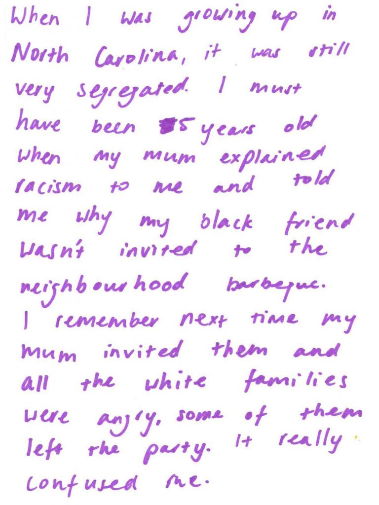 When I was growing up in North Carolina, it was still very segregated. I must have been 5 years old when my mum explained racism to me and told me why my black friend wasn’t invited to the neighbourhood barbeque. I remember next time my mum invited them and all the white families were angry, some of them left the party. It really confused me.
