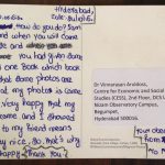 Children enjoyed selecting the postcards off the wall (in London) and off tables (in Athens and in Hyderabad). I got one postcard back from one child in London: a pop-art drawing of various old cars, the 2CV most lodged in my mind – the child’s own choice, not a postcard from the collection. Vinnarasan received one Magnum postcard by post, and Christos was shown a postcard one child intended to send him but decided to keep for herself instead.