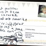 I have no idea how prevalent the practice of sending postcards is anymore. However, in the context of the children’s workshops we thought this somewhat old, maybe a bit antiquated practice might provide an intriguing and novel way for children and researchers to keep in touch over the summer on the one hand, and a way for children, who did not have their own phones or email addresses at this point, to make independent contact with the ethnographers, should they wish.