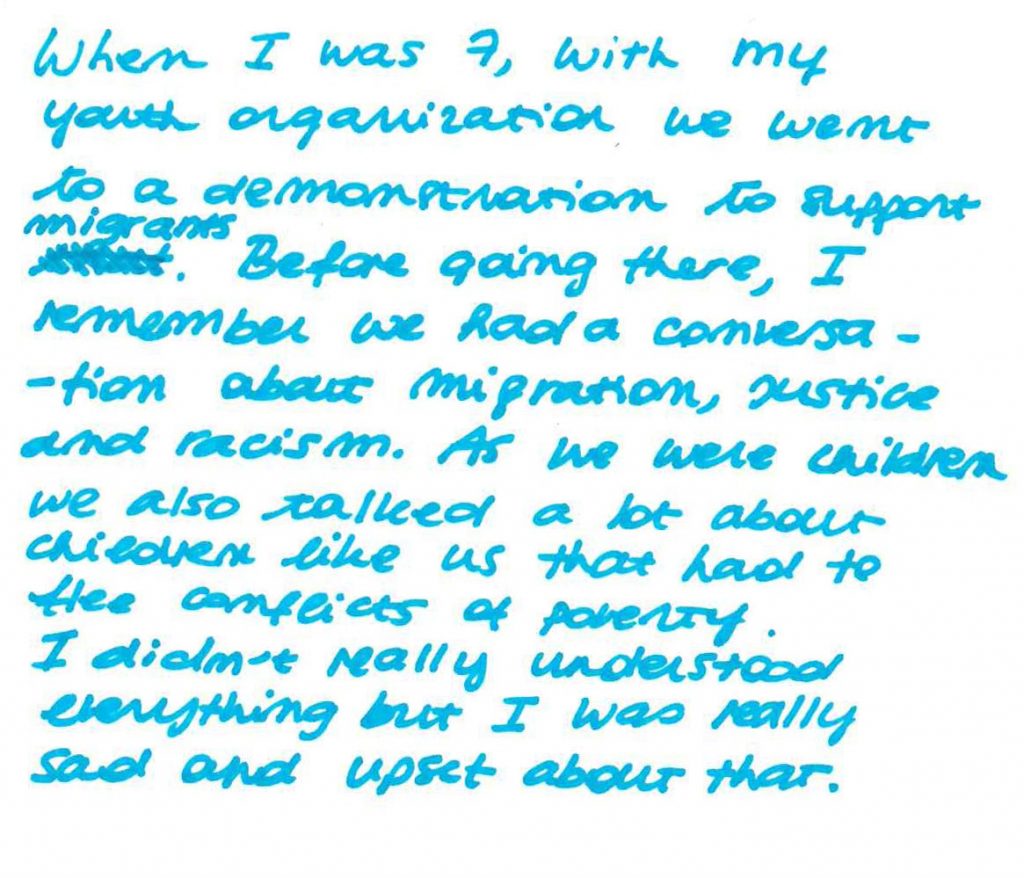 When I was 7, with my youth organization we went to a demonstration to support migrants. Before going there, I remember we had a conversation about migration, justice and racism, As we were children we also talked a lot about children like us that had to flee conflicts or poverty.