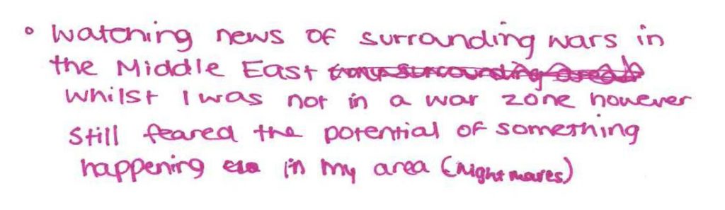 Whilst I was not in a war zone however still feared the potential of something happening in my area (nightmares)