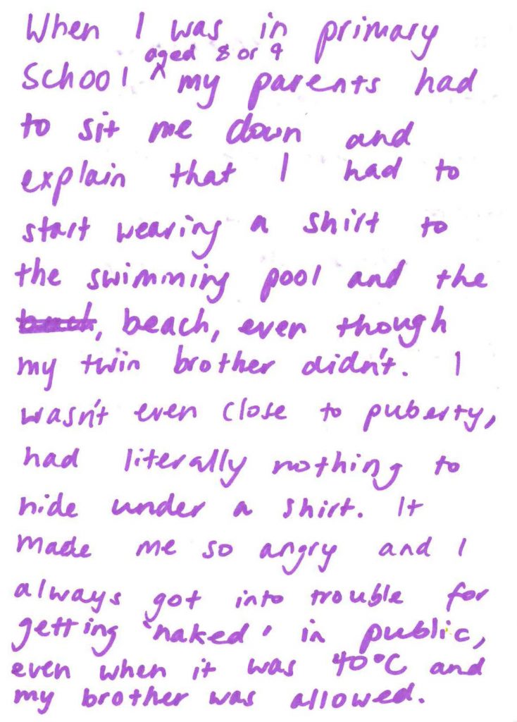 When I was in primary school aged 8 or 9 my parents had to sit me down and explain that I had to start wearing a shift to the swimming pool and the beach, even though my twin brother didn’t. I wasn’t even close to puberty, had literally nothing to hide under a shirt, It made me so angry and I always got into trouble for getting ‘naked’ in public, even when it was 40°C and my brother was allowed.
