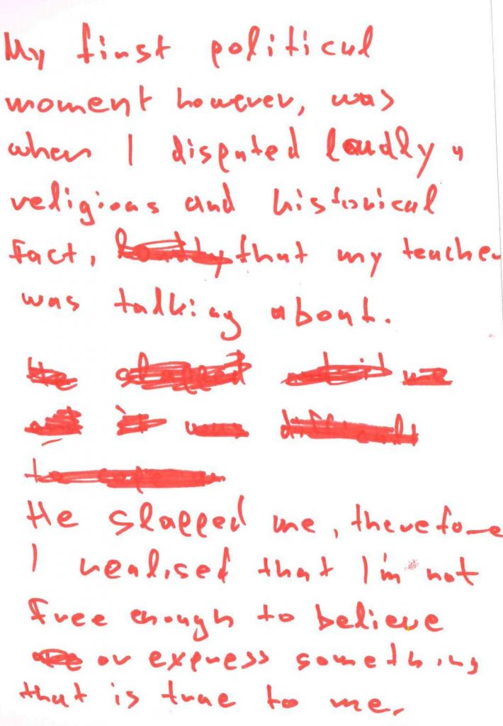 He slapped me, therefore I realised that I’m not free enough to believe or express something that is true to me.