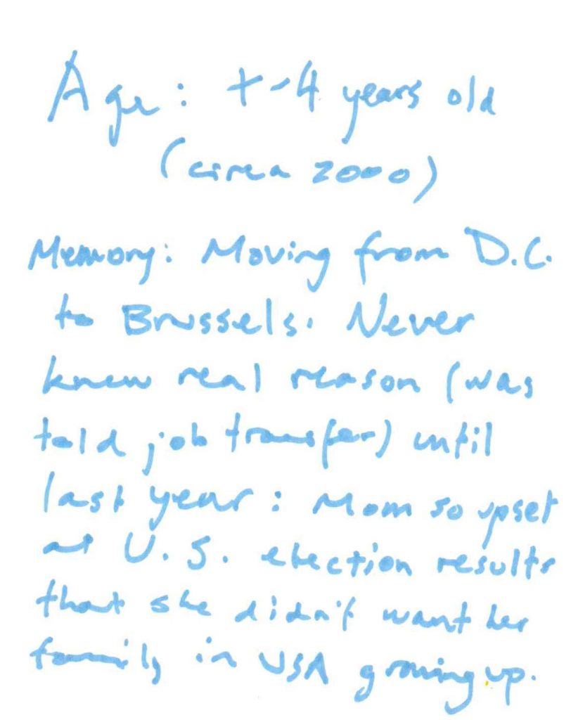 Memory: Moving from D.C. to Brussels. Never knew real reason (was told job transfer) until last year: Mom so upset at U.S election results that she didn’t want her family in USA growing up.