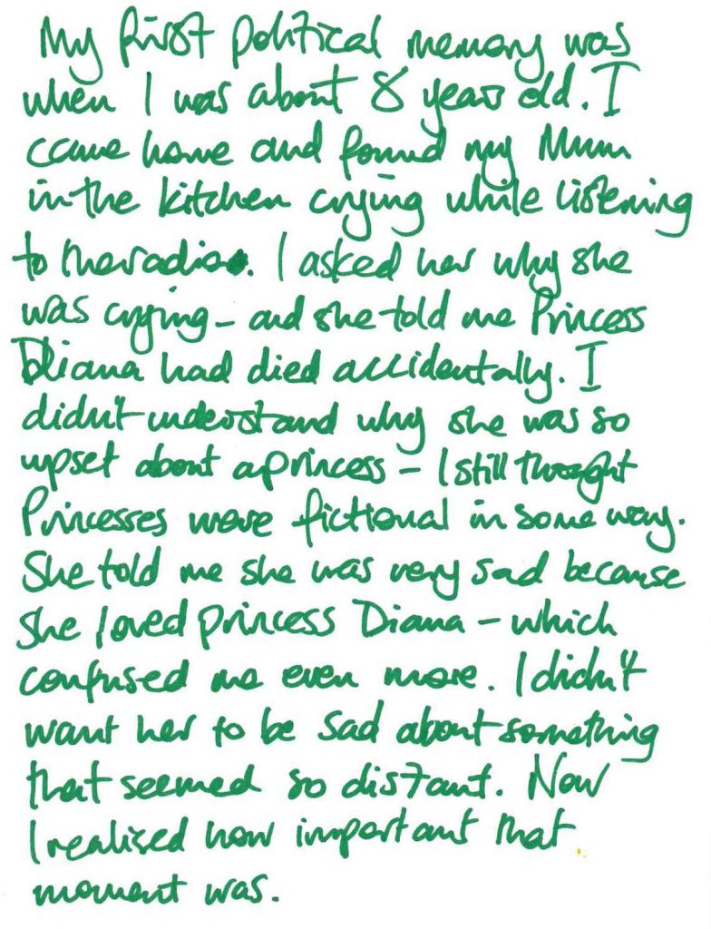 My first political memory was when I was about 8 years old. I came home and found my mum in the kitchen crying while listening to the radio. I asked her why she was crying – and she told me Princess Diana had died accidentally. I didn’t understand why she was so upset about a princess – I still thought Princesses were fictional in some way. She told me she was very sad because she loved Princess Diana – which confused me even more. I didn’t want her to be sad about something that seemed so distant. Now I realised how important that moment was.