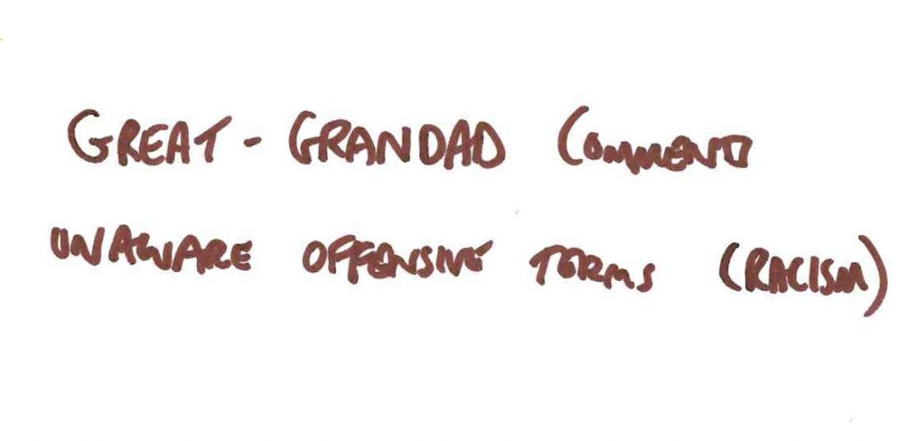 Earliest political memory #129 Great-Grandad comments Unaware offensive terms (Racism) Tags: Themes: Racism Locations: Unknown Decades: Unknown Ages: Unknown Genders: Unknown Ethnicities: Unknown Occupations: Unknown Download original