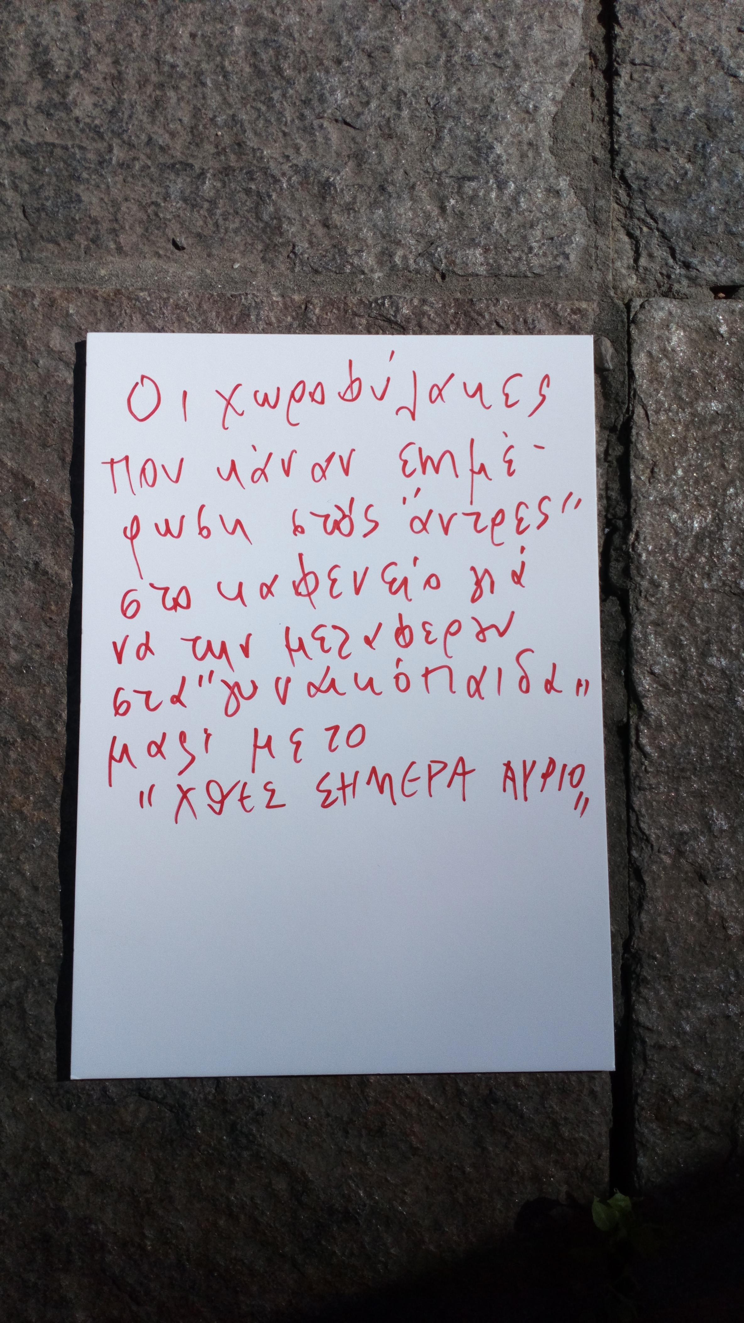 Constables notifying the men at the “kafeneia” (coffeehouses), so that the information would reach the women and children. Also, “Yesterday, Today, Tomorrow”.