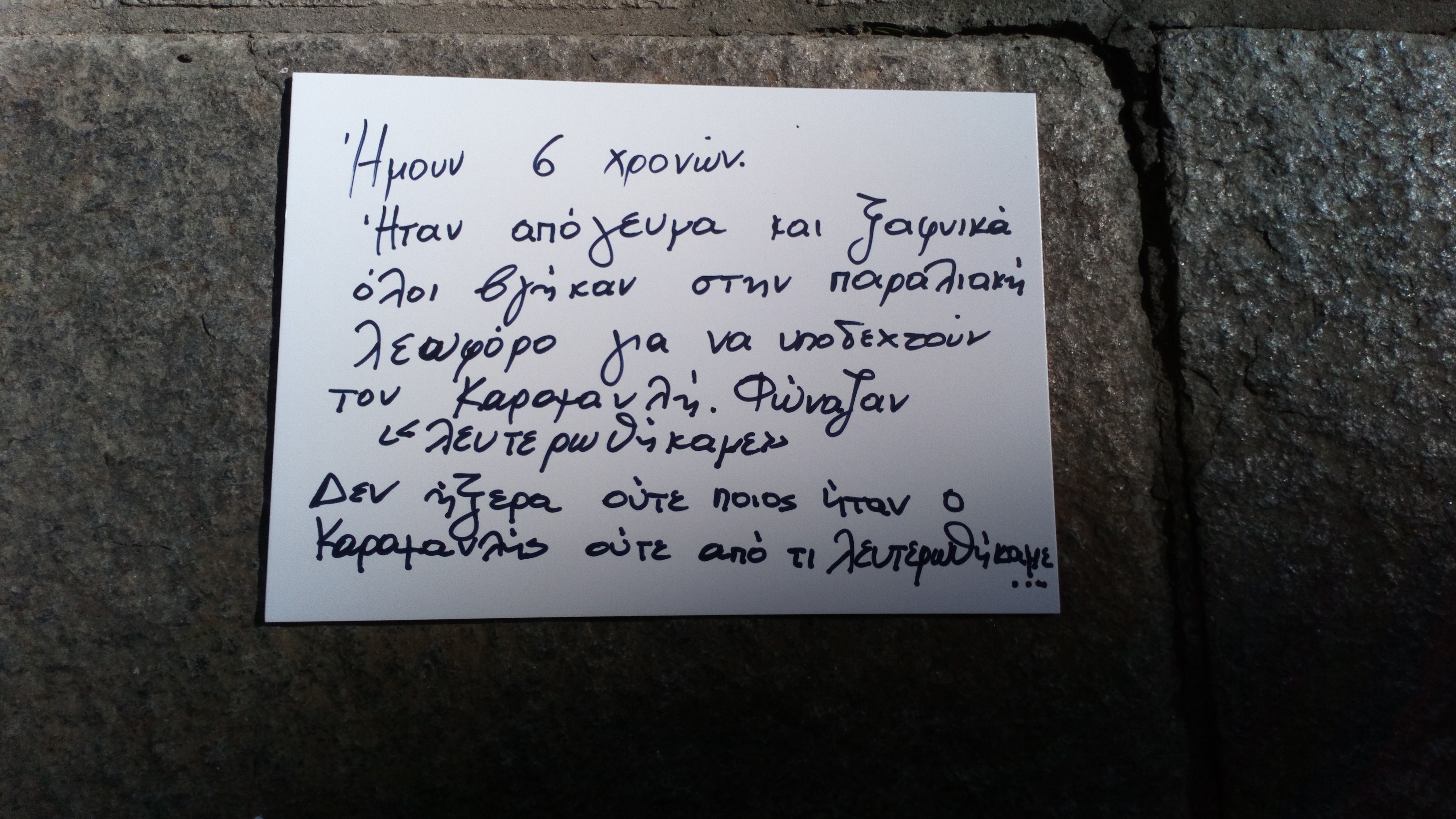 I was six years old. It was afternoon and, suddenly, everyone was gathering at the coastal avenue to welcome Karamanlis. They were crying “we are free”. I didn’t know who Karamanlis was and I had no idea from whom we had been freed[1].