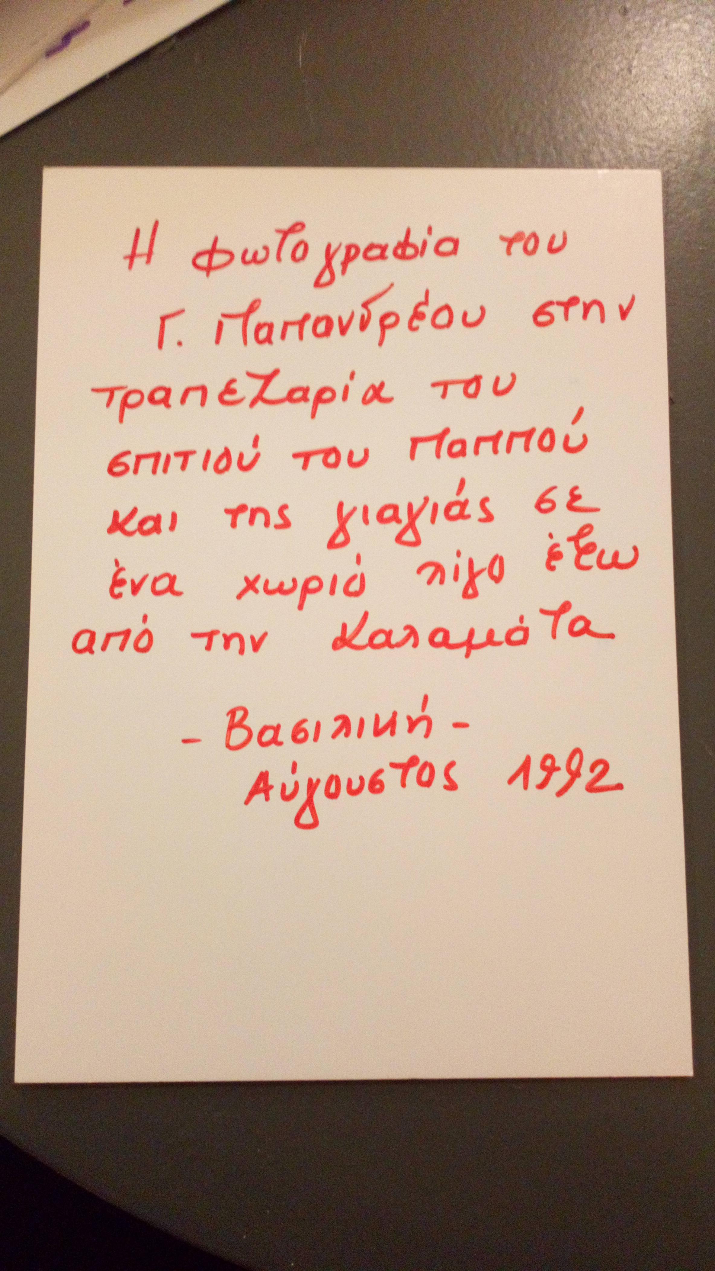 Η φωτογραφία του Γ. Παπανδρέου στην τραπεζαρία του σπιτιού του παππού και της γιαγιάς σε ένα χωριό λίγο έξω από την Καλαμάτα. Αύγουστος 1992.