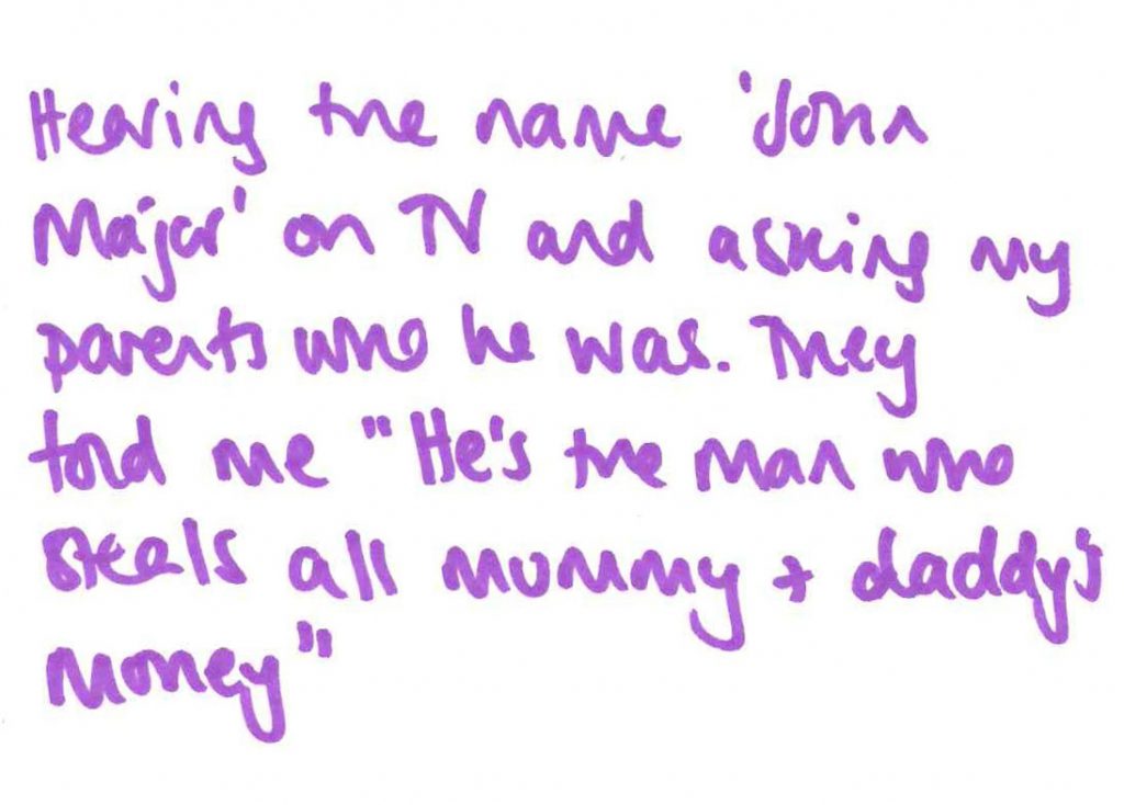 Hearing the name ‘John Major’ on TV and asking mu parents who he was. They told me “He’s the man who steals all mummy + daddy’s money”
