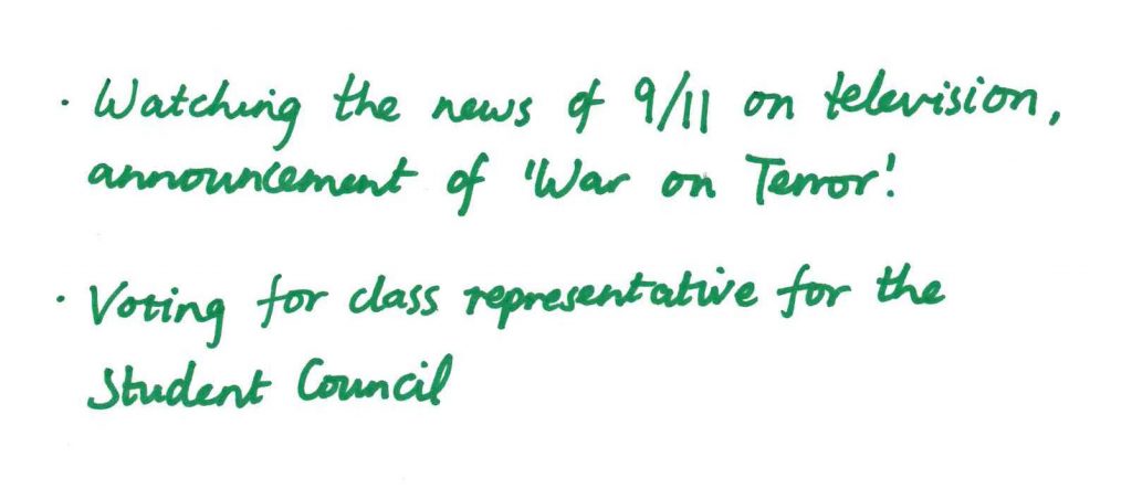 Watching news of 9/11 on television, announcement of ‘War on Terror’.
